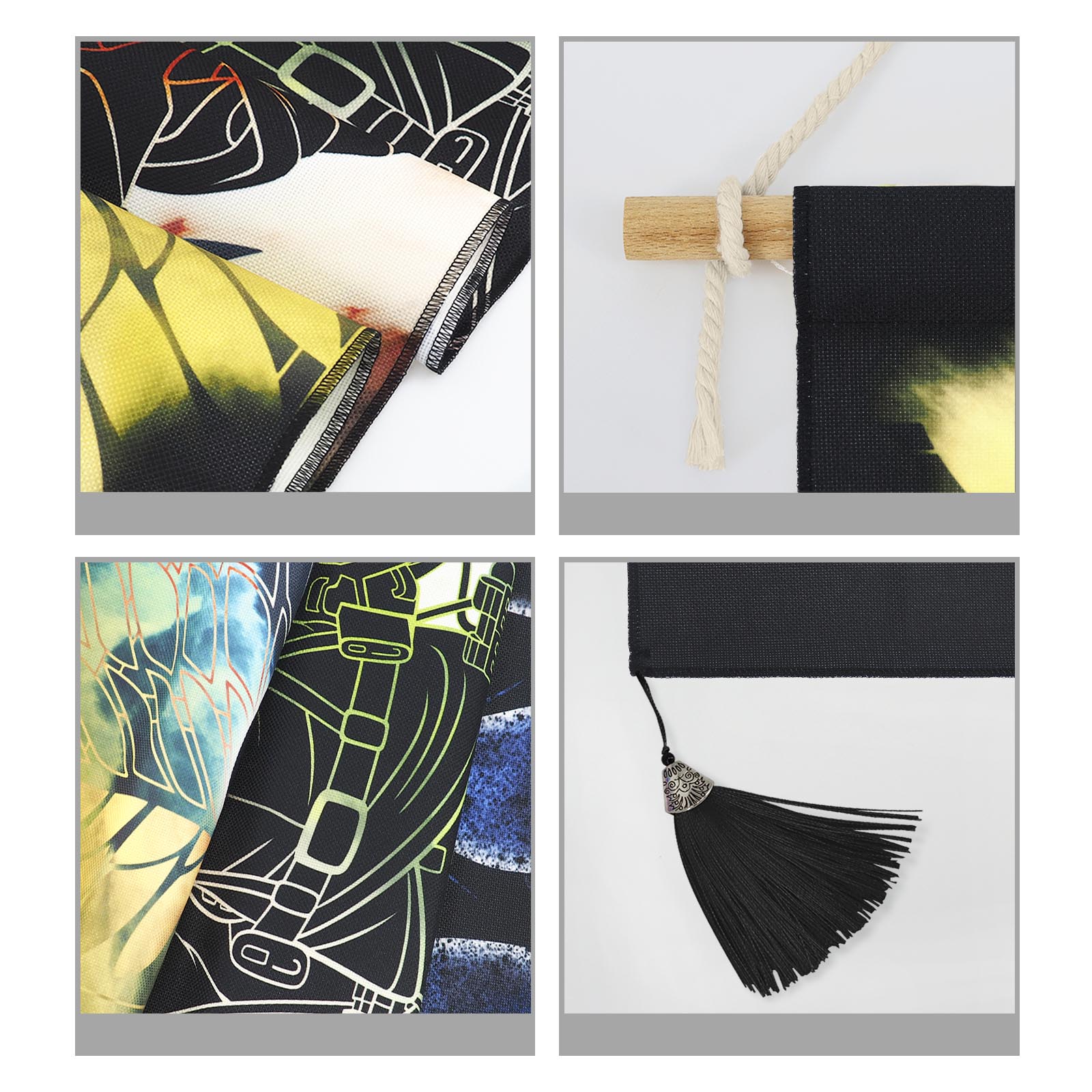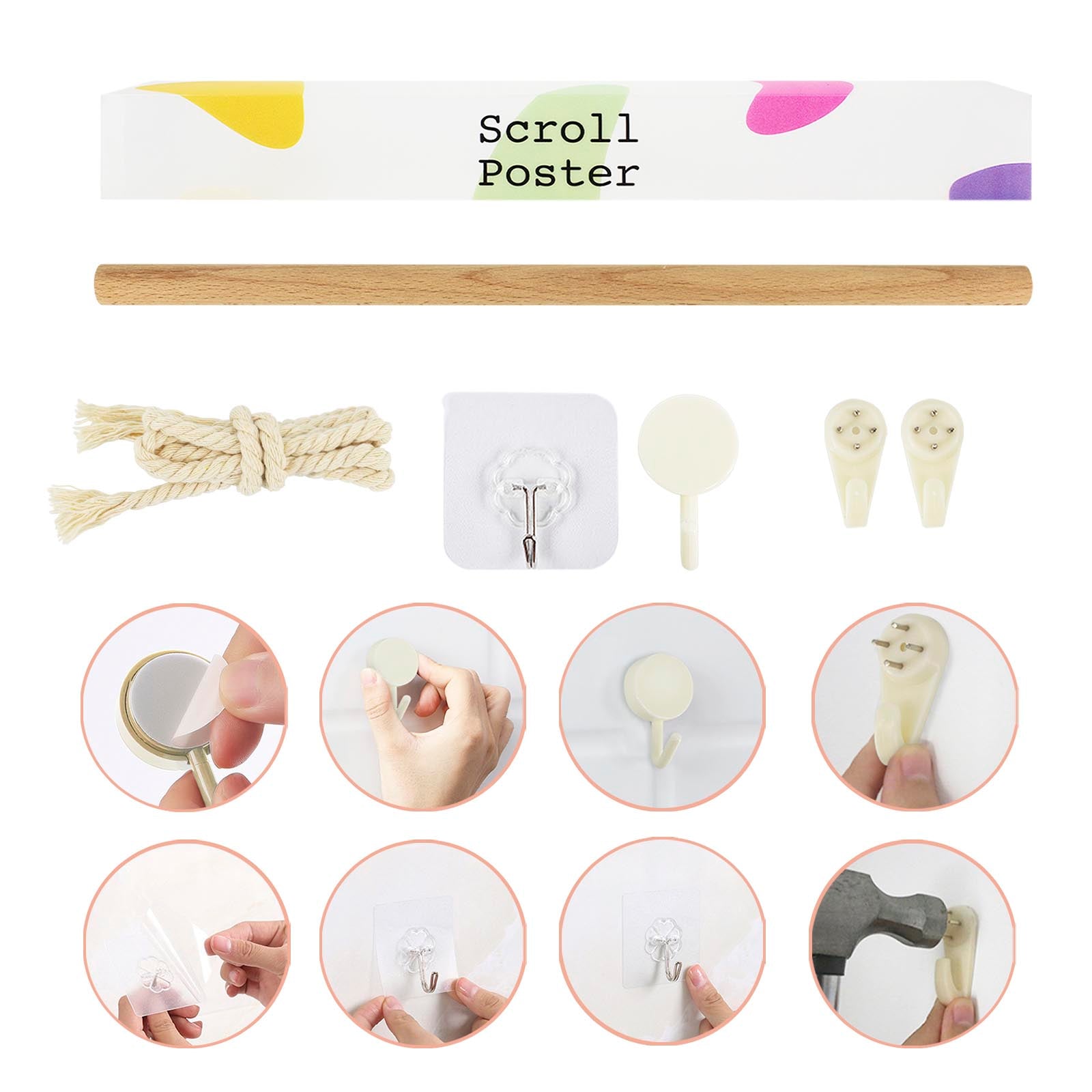 - Lieferumfang: 1x Rollbild, 1x Holzstange, 1x Strick, 2x Haken (selbstklebend), 2x Haken (mit Nägeln), 2x schwarze Bordeln