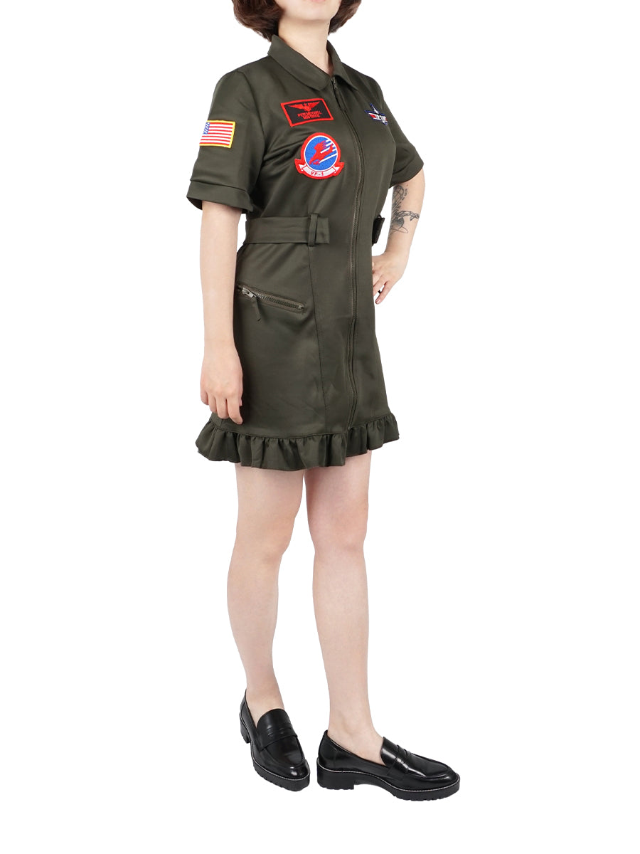 Fliegerkombi Kleid, Kampfpiloten Overall Damen Kostüm, Olivegrün, Größen: S - L