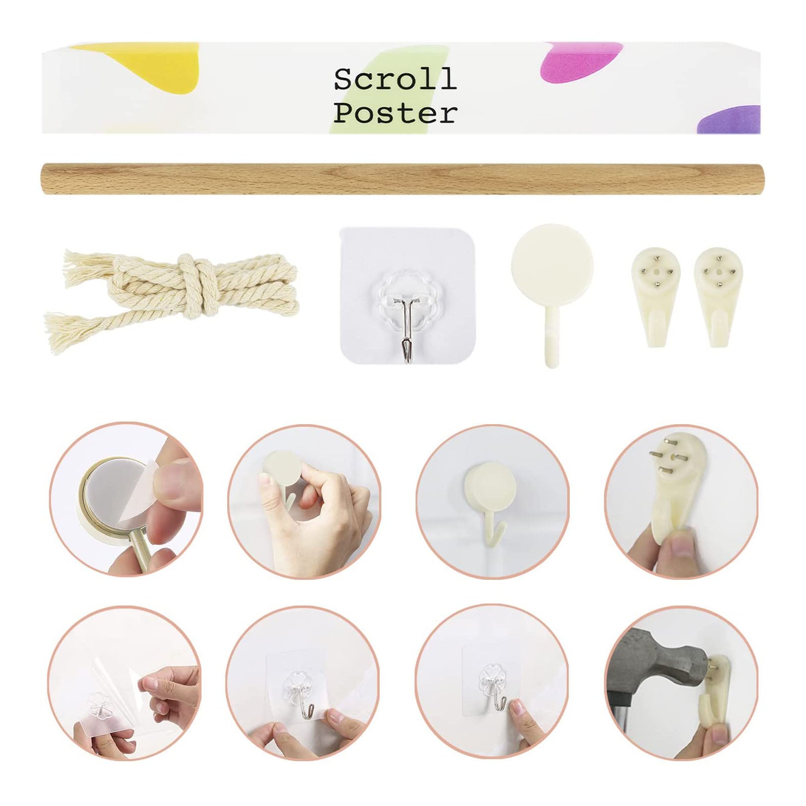 - Lieferumfang: 1x Rollbild, 1x Holzstab, 1x Kordel, 2x Klebehaken, 2x Nagelhaken
