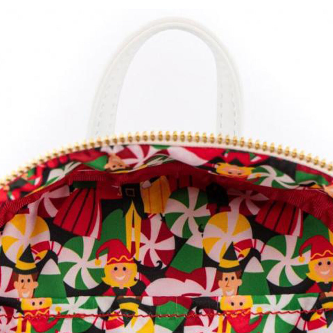 Der Rucksack ist aus hochwertigem Kunstleder gefertigt und zeigt auf der Vorderseite eine festliche Szene mit Buddy und seinen Freunden aus dem Weihnachtsfilm-Klassiker Elf. Die goldenen Akzente, die verspielten Farben und die Schneeflocken-Details machen dieses Accessoire zu einem echten Hingucker. Die Applikationen sind teils genäht, teils gedruckt, was für eine spannende, strukturierte Optik sorgt.
