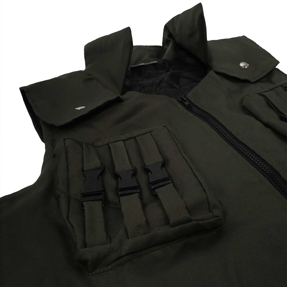 Die Weste besticht durch ihr robustes, zugleich leichtes Material, das angenehmen Tragekomfort auch bei langen Events garantiert. Das praktische Design mit mehreren Taschen ermöglicht das Verstauen kleiner Utensilien, während der Reißverschluss für einen einfachen Einstieg sorgt. Die authentischen Details, wie das charakteristische Grün und die typische Schnittführung, machen diese Chunin Weste zu einem echten Hingucker.