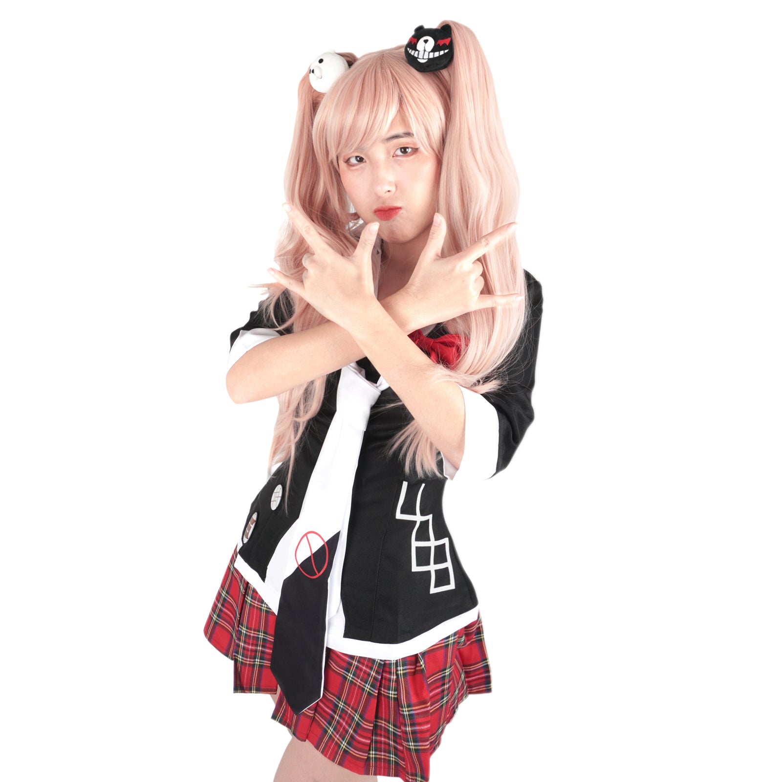 Perücke von Junko Enoshima für Danganronpa Fans, Cosplay Wig mit Monokuma Haarspangen, Rosa