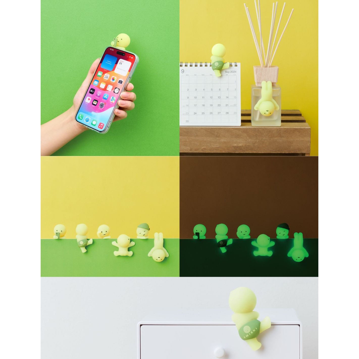 Die Figuren sind klein, handlich und aus hochwertigem ATBC-PVC gefertigt. Mit einer Größe von etwa 46–54?mm Breite und 48–76?mm Höhe passen sie perfekt in Regale, auf Schreibtische oder Nachttische. Das Glow-in-the-Dark-Material erzeugt ein beruhigendes, sanftes Leuchten bei Dunkelheit und schafft so eine magische Atmosphäre im Raum. (smiski.co
