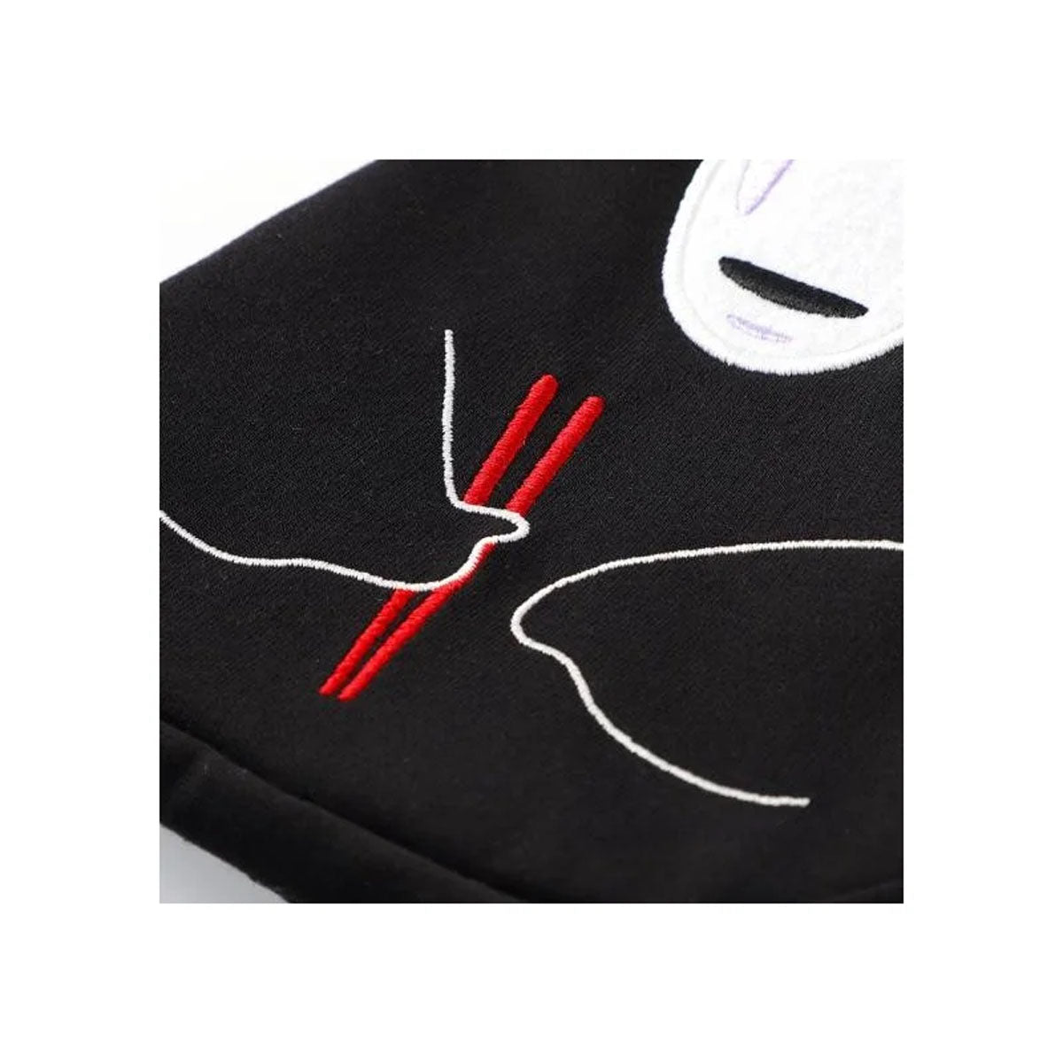 Das minimalistische Design besticht durch eine hochwertige Stickerei auf tiefschwarzem Grund. Zu sehen ist das geheimnisvolle Ohngesicht (No Face), dessen Hände ein Paar rote Essstäbchen halten – ein liebevolles Detail für jeden Fan der Serie. Dank der kompakten Maße von 20 x 16 x 12 cm bietet die Tasche idealen Platz für deine Bento-Box und einen Snack.