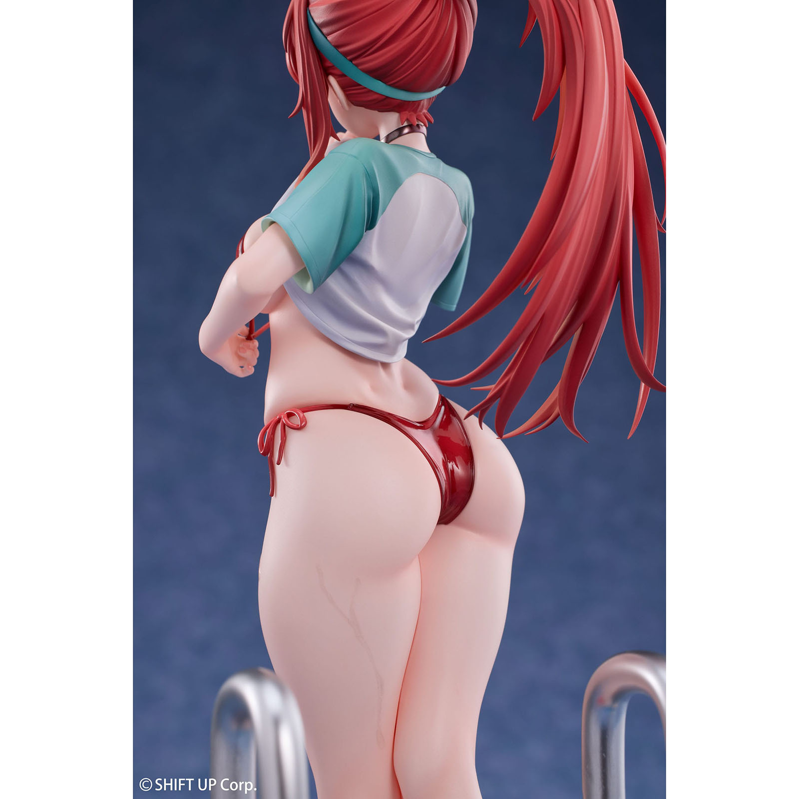 Ein weiteres Highlight sind die fein modellierten Wassereffekte, die sich realistisch über Bauch und Beine ziehen. Diese Details verleihen der Figur zusätzliche Tiefe und unterstreichen die hohe handwerkliche Qualität. Die aufwendig gestaltete Base zeigt eine Pool-Szenerie mit Handläufen, Schwimmbrett und Rapis Tragetasche inklusive Zubehör. Selbst kleinste Details wie der Name und eine Comic-Grafik auf ihren Flip-Flops wurden sorgfältig umgesetzt.