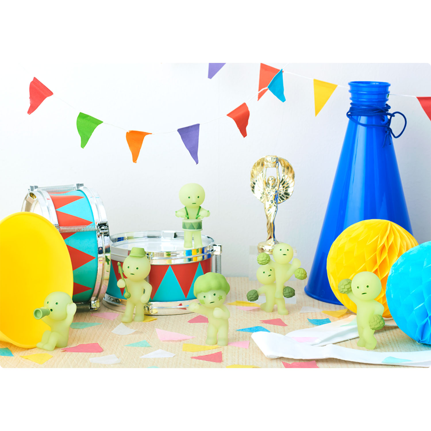 Die Smiski Cheer Series zeigt die kleinen, neugierigen Kreaturen in fröhlichen und energiegeladenen Szenen. Einige Smiski übernehmen die Rolle eines Dirigenten, andere schlagen rhythmisch auf eine Trommel, wieder andere blasen in ein Horn oder feuern als Cheerleader begeistert an. Jede Figur strahlt gute Laune und Bewegung aus.