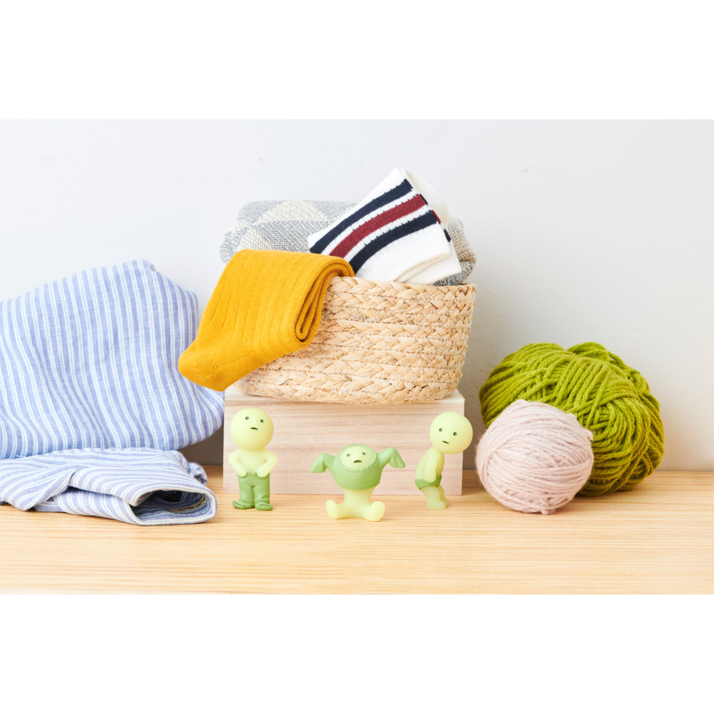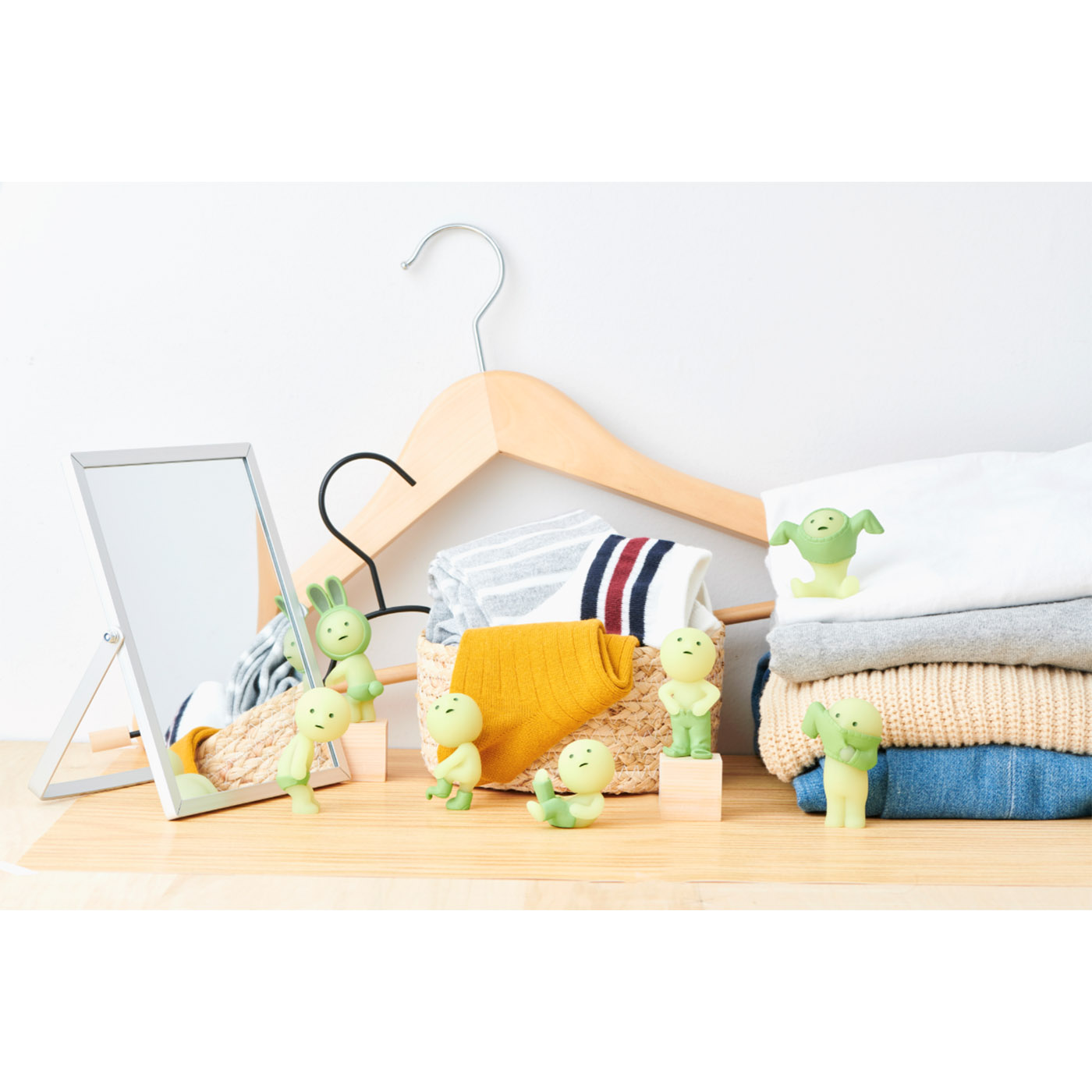 Die Smiski Dressing Series zeigt kleine, neugierige Kreaturen beim Anziehen. Einige Smiski stehen etwas unbeholfen und ziehen einen Pullover an, andere sind schüchtern beim Anziehen von Unterwäsche, wieder andere sitzen auf dem Boden und ziehen Hosen an, und manche winden ihren Kopf mit Mühe durch den Kragen.